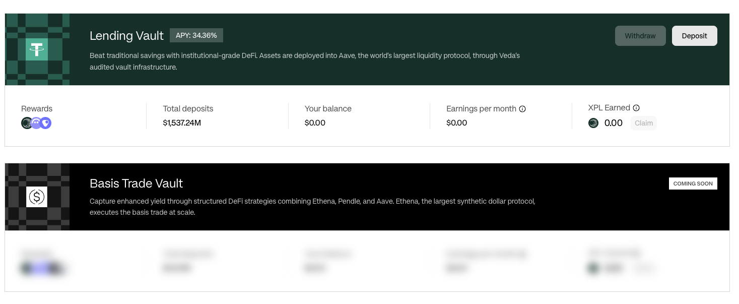 这个活动是 Plasma 官方发起的,在 Veda 协议下的 PlasmaUSD Vault 以持币挖矿的形式发放 WXPL,当前只开放了 Lending Vault,未来也会开放 Basis Trade Vault。