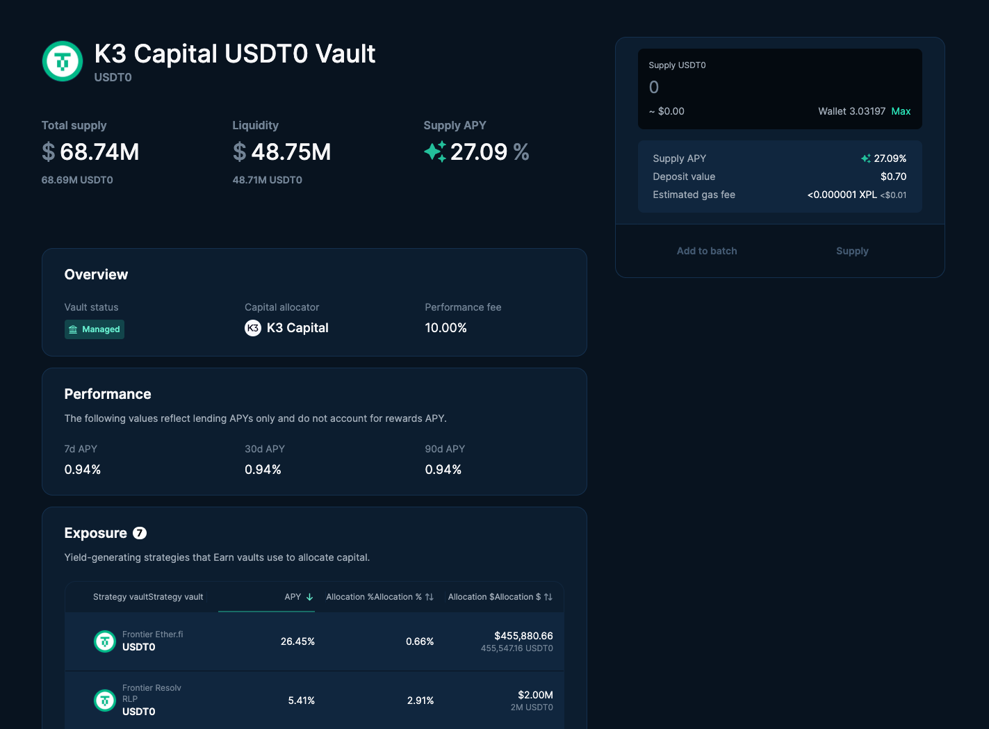在 Plasma 的 Euler 协议中,由 K3 Capital 管理的 USDT0 Vault 当前年化收益率大约为 27%,每日激励分配约 5.5 万美元等值的 WXPL。
