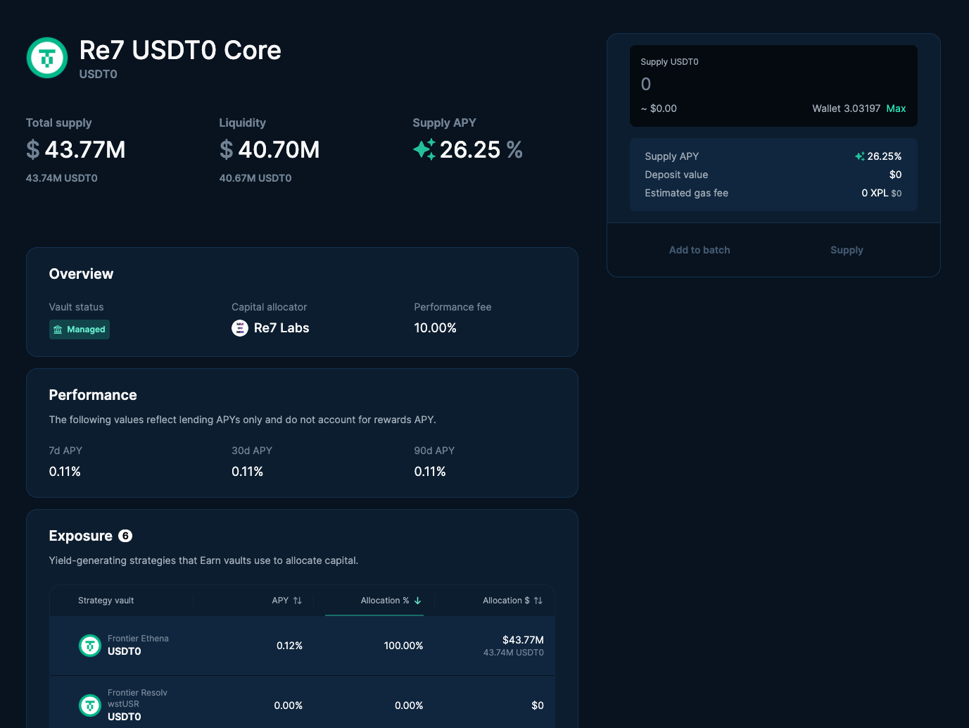 用户只需要存入在 Plasma 主网上的 USDT0,将 USDT0 存入(Supply)该 Vault 以开始挖矿。