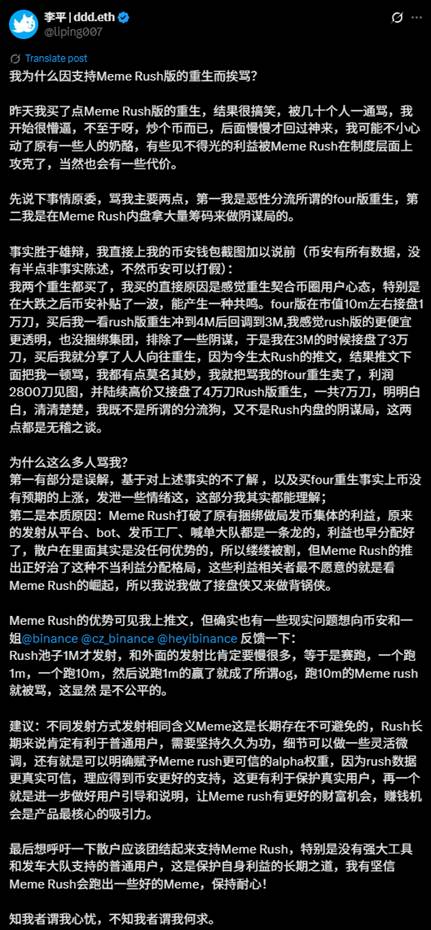 在新「重生」币快速上涨的期间,OG「重生」币遭遇了重创,一度下跌超过 50%。这时,KOL 李平的一条支持新「重生」币的推文,让他成为了玩家们声讨的对象: